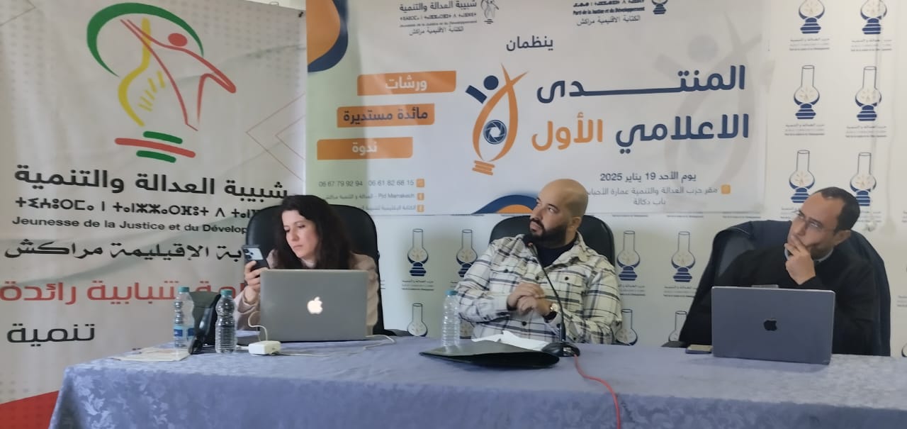 نظمت شبيبة العدالة والتنمية بمراكش،المنتدى الإعلامي الأول،حيث نظمت على هامش هذا المنتدى ندوة حول التواصل الإعلامي السياسي ،أطره يونس مسكين، مدير الأخبار في صحيفة صوت المغرب ،وأمينة فوزي زيزي المستشارة في الإعلام والتواصل، وأشرف الملهوف عضو الكتابة الإقليمية لحزب العدالة والتنمية على تسيير الجلسة.