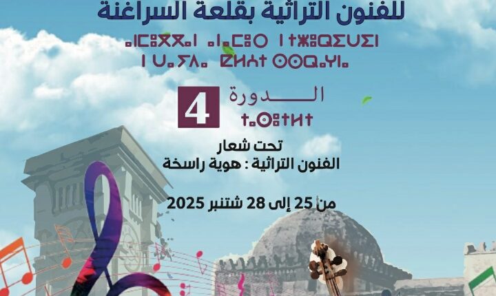 تحت شعار “الفنون التراثية..هوية راسخة” تنظم وزارة الشباب والثقافة والتواصل -قطاع الثقافة- فعاليات الدورة الرابعة للمهرجان الوطني للفنون التراثية بمدينة قلعة السراغنة في الفترة الممتدة ما بين 25 و28 شتنبر 2025. وذلك بشراكة مع عمالة إقليم قلعة السراغنة والمجلس الاقليمي والمجلس الجماعي.
