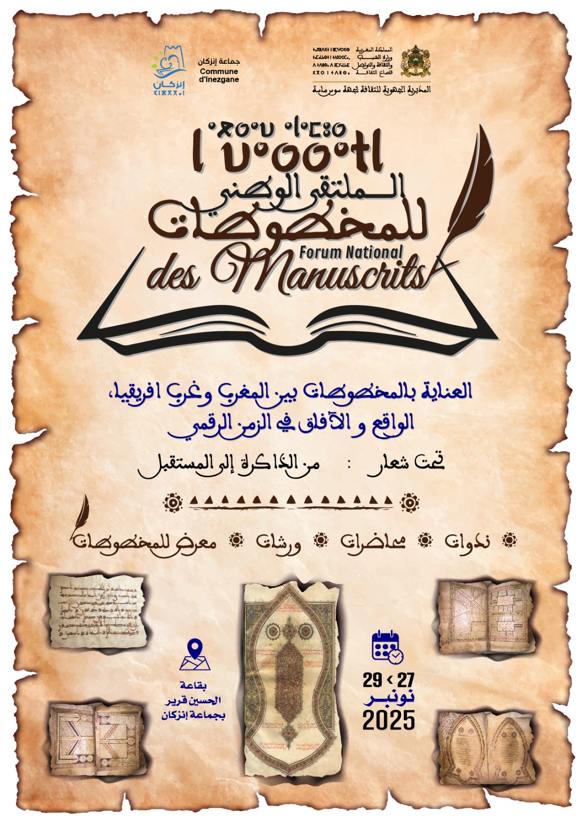 تنظم المديرية الجهوية للثقافة بجهة سوس ماسة بشراكة مع جماعة انزكان الملتقى الوطني للمخطوطات أيام 28.27 و29 نونبر 2025 بقاعة الحسين قرير بجماعة انزكان تحت شعار من الذاكرة الى المستقبل.