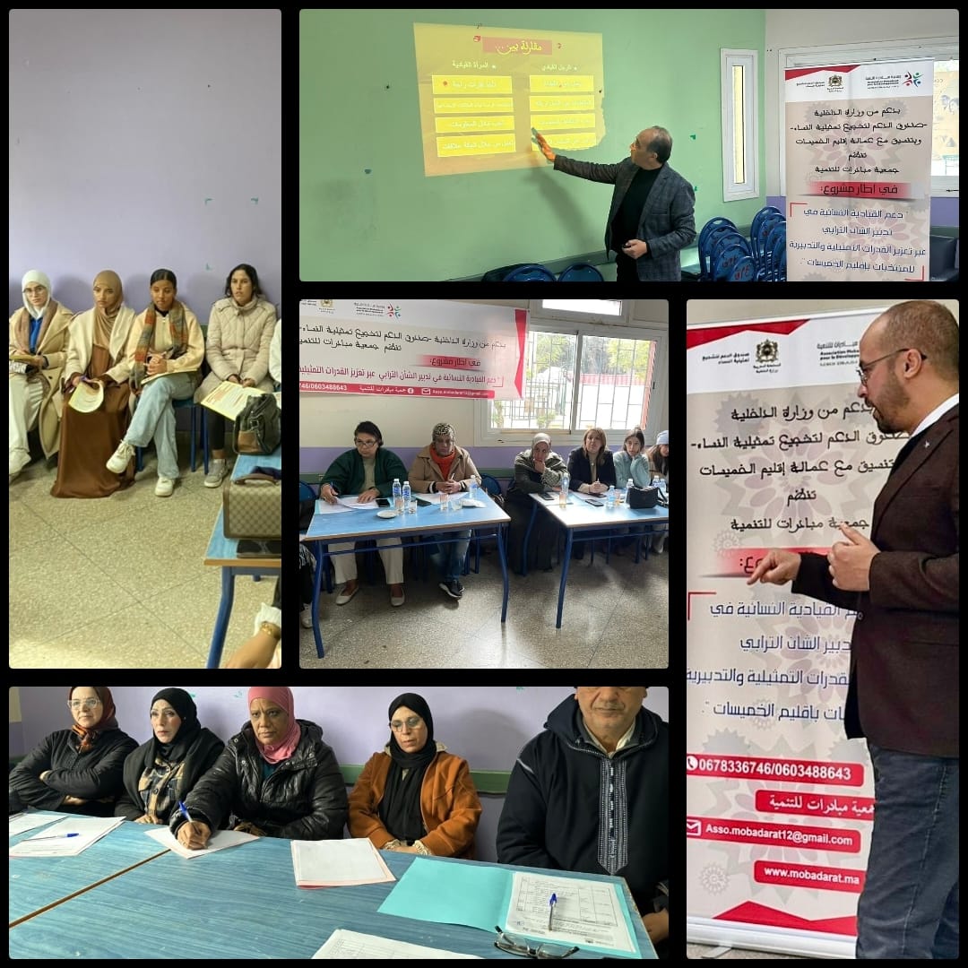 في إطار تنفيذ مشروع دعم القيادية النسائية في تدبير الشأن الترابي عبر تعزيز القدرات التمثيلية والتدبيرية للمنتخبات بإقليم الخميسات، موضوع اتفاقية شراكة تجمع جمعية مبادرات للتنمية بوزارة الداخلية، صندوق الدعم لتشجيع تمثيلية النساء، وبتنسيق مع عمالة إقليم الخميسات، نظّمت الجمعية الورشة التحسيسية الثانية والثالثة يومي السبت والأحد 03 و04 يناير 2026 بدار الشباب عبد السلام المساري القريشي بمدينة تيفلت.